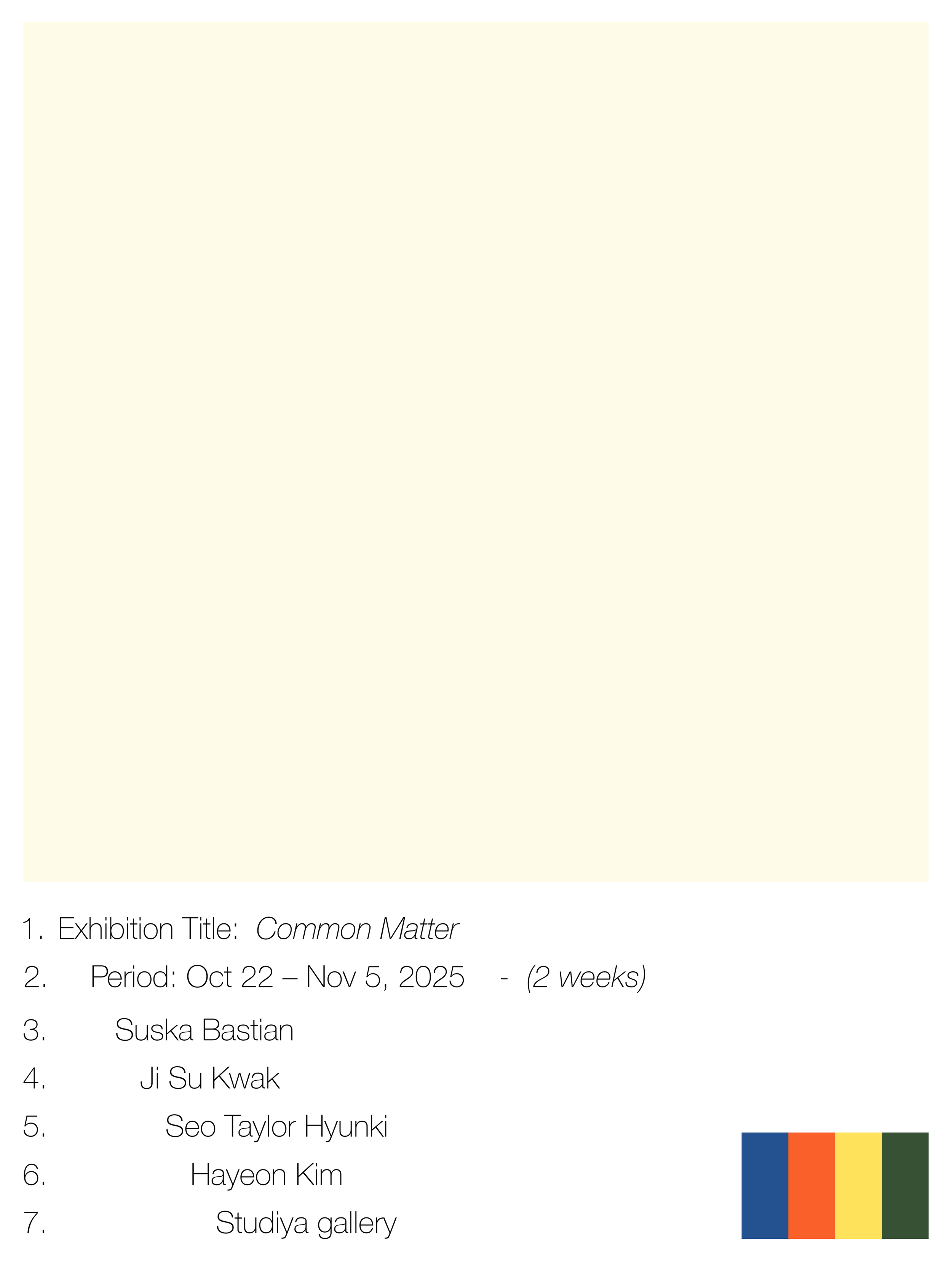 This project forms a cyclical structure between exhibitions, transferring the sensibilities and reflections of each previous show to the next through the participation of new artists. Each exhibition stands as an independent outcome while simultaneously becoming the origin of the subsequent one. Within this structure, the exhibition functions not as a singular event but as an ongoing process of experimentation, operating as a “field of transformation” that mediates between itself and renews within new contexts. In other words, 《Common Matter》 is situated not as a disconnected event, but within a flow where sensation is translated and rearranged into different forms. It is hoped that within this lingering resonance, it may function as a field that renews itself.